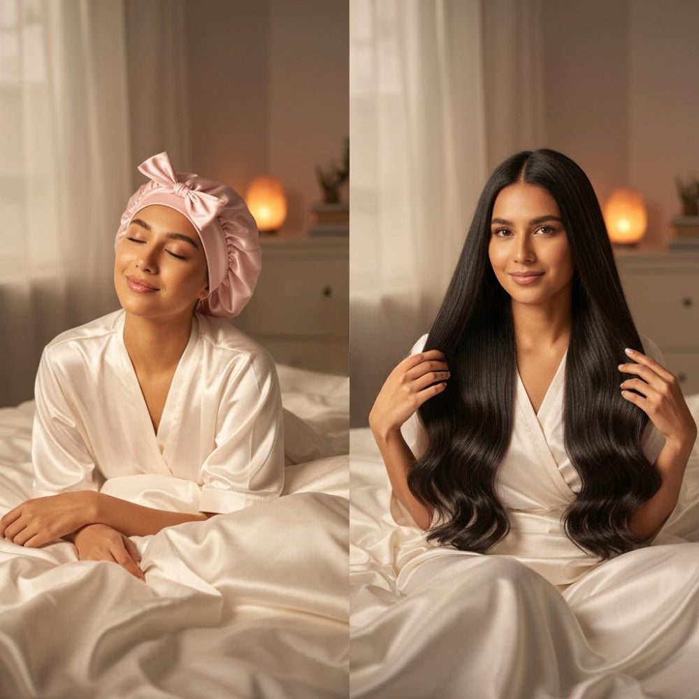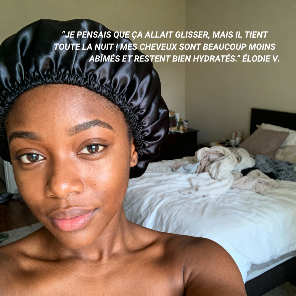 Notre bonnet protège vos cheveux toute la nuit et les garde lisses, doux et brillants, pour des matins sans effort.
